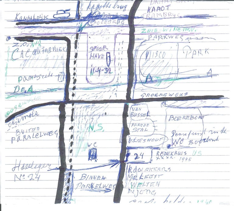 De heer Hazeleger heeft de oorlogslocatie voor me uitgetekend. Zie onder andere de tank links boven en het huisnummer 24 rechts.