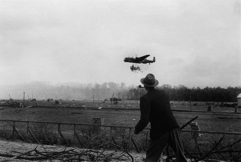 Na nog weer kilometers sjouwen naar het centrum overnachten we in een hotel. Na nog 2 dagen in de kou bereikten we Rijswijk, ruim een uur na het ingaan van de spertijd. Uitgehongerd! Wat kregen we...gekookte suikerbieten, bereid op hout van ons tuinhekje. Na maanden hongeren en kou lijden kwam de zondag in april, toen er weer vliegtuigen laag over vlogen! Geen Junkers 52 deze keer, maar Lancasters en de volgende dag Vliegende Forten. Geen bommen, zoals per vergissing op 3 maart 1945 op Den Haag Bezuidenhout, maar voedselpakketten. En wat smaakten op 7 mei de droge koeken heerlijk.