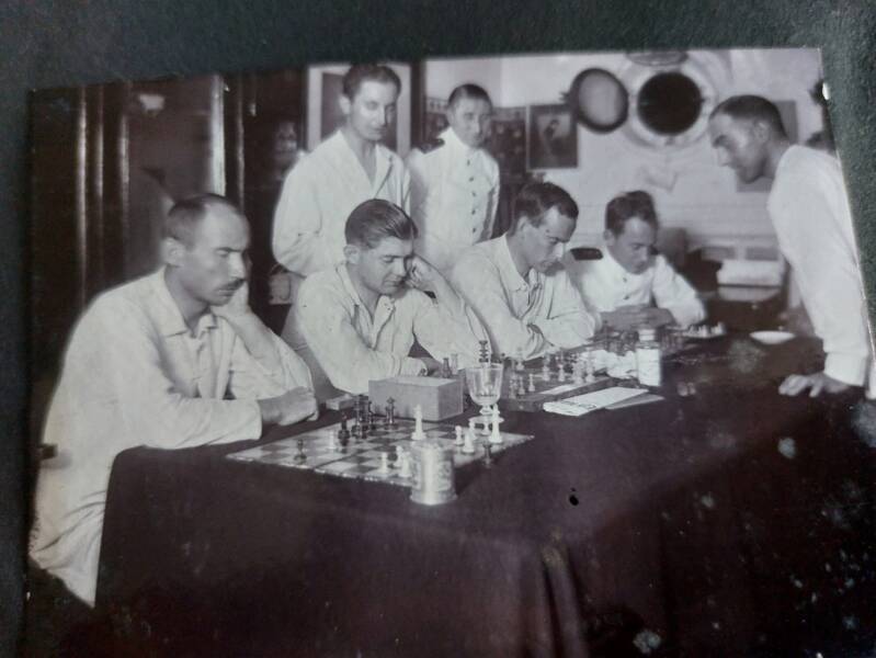 Onderstaande is een foto van waarschijnlijk op de HMS Jakhals of de HMS van Gogh. Mijn vader heeft mij verteld dat opa bevriend was geweest met een van de commandanten. En, dat hij in de officiers mess tegen de commandant had gezegd: “Op dit schip wordt goed geschaakt. Ik daag de bemanning uit voor een potje simultaanschaak!” waarop de commandant direct stelde: “Als je maar wint!” Dat zegde hij toe en deze sluwe rat won ook. Het was de tijd van bezuinigingen en de muiterij op de Zeven Provinciën. Wat mijn vader niet geweten zal hebben, is dat dit zo goed als zeker voorgekookt was door de twee vrienden. De foto laat zien dat niet-officieren in de officiersmess simultaan schaken. Dat was “not done” maar als de commandant al besloten heeft, houdt verder iedereen z’n mond. En voorts laat een commandant zich zo anders niet voor het blok zetten. Een listige manier om de jeu erin te houden.
