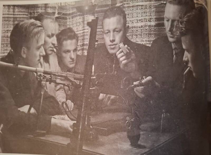 Leden van de BS krijgen wapeninstructie van het verzet, derde van links mijn broer Berend