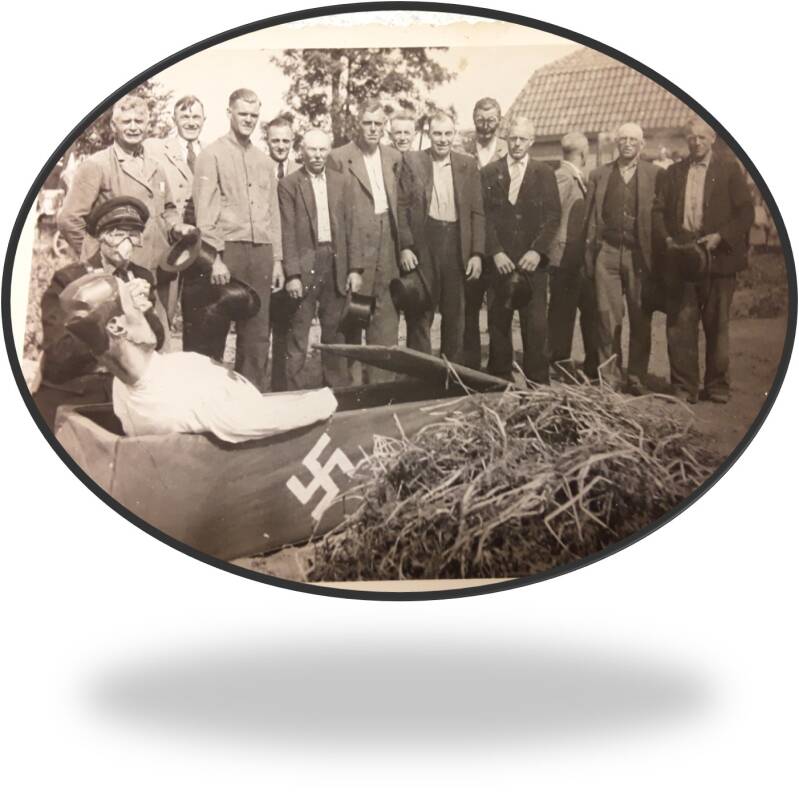Op de foto staan mannen die een stemmig jasje of kostuum hadden aangeschoten, de hoge zwarte hoed ingetogen in de hand ter ere van de doden die deze man in de kist op zijn geweten heeft. We zien van links naar rechts de volgende personen: Jan van de Park, Piet Reus, Bep van Kooten, Arie Pronk, Arie Kunst, Jaap Bont, Jaap de Boer, Dirk de Moel, Lou de Boer, Wim van de Park, Ruurd Cnossen, Ger Meijering, Cor Harderwijk en Jan Venneker.