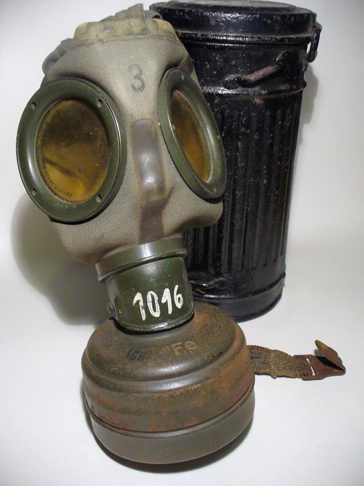 Een vroeg model (1936) Duits gasmasker inclusief gasmaskerbus (vermoedelijk na de oorlog overgeschilderd). Het gasmasker behoorde tot de standaard uitrusting van elke Duitse soldaat. Dit masker is in november 1939 geproduceerd.